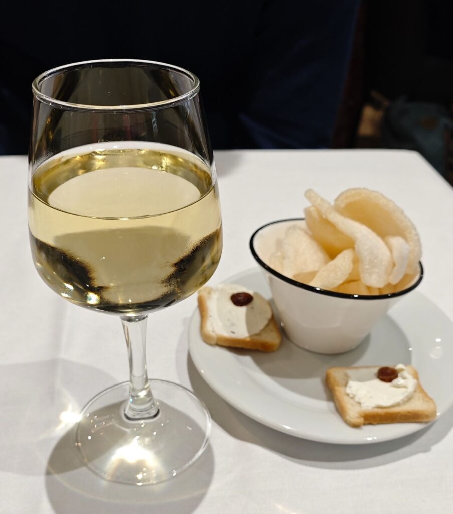 🥂 We were welcomed with a free amuse-bouche: delicate fresh goat cheese topped with herbs, sea salt, and a plump raisin, all on a crisp baguette.