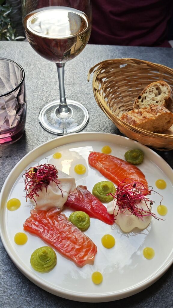 Generous slices of velvety, cold-smoked salmon lay beside a rich, terrine-style duck foie gras. The foie gras was smooth and creamy, with a deep, earthy richness elevated by sea salt and smoky paprika powder.