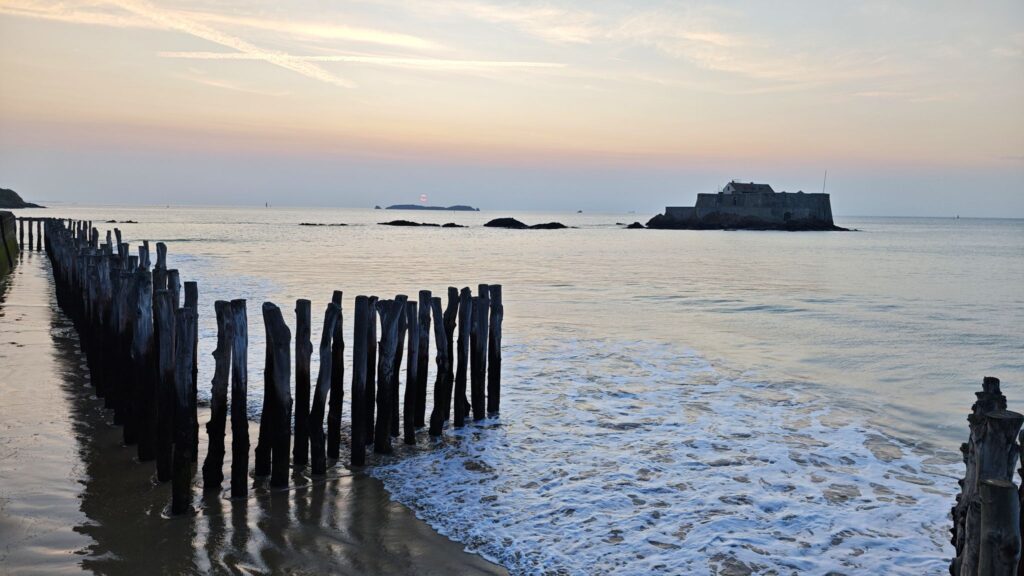 There’s no better way to meet Saint-Malo than by walking its seaside at golden hour. As soon as we dropped our bags, we were drawn by the ancient granite walls. The sea air, salty and cool, filled our lungs. To our left, the tide was rushing in, slowly transforming the sandy beaches into a shimmering mirror.