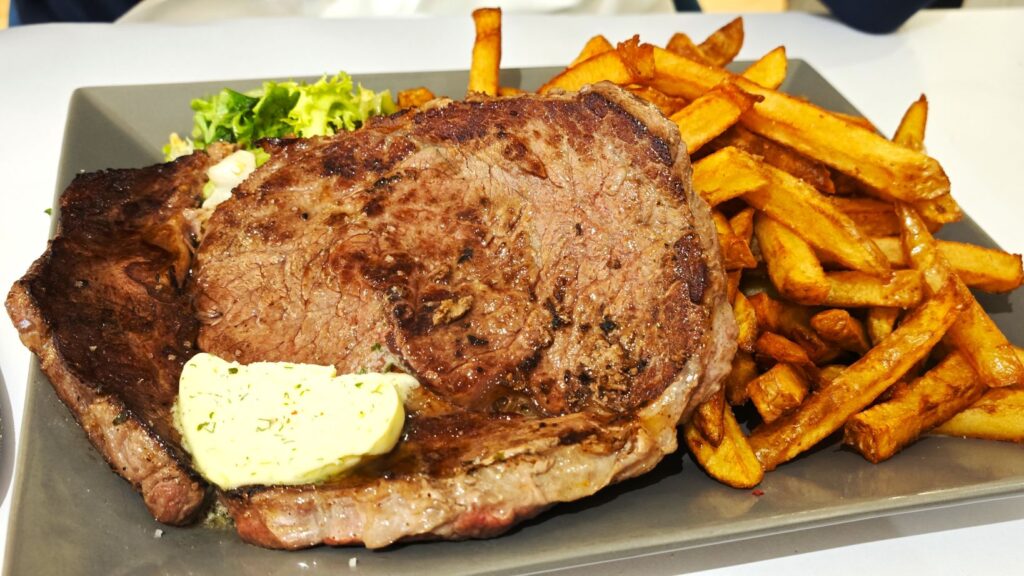 That steak, grilled to robust, meaty perfection, has a chewy texture and just a hint of fat. Topped with a melting slab of herbal butter (maître d’hôtel), it is rich, hearty, and satisfyingly beefy.