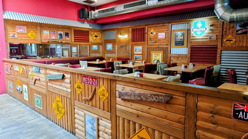 Das Interieur setzt konsequent auf Holz: Von den Wänden bis hin zum massiven Mobiliar spiegelt das Design die Atmosphäre des Outbacks wider. Diese Wahl kommt nicht von ungefähr, denn die Weite der australischen Wüste, die einsamen Highways und das entlegene Farmland sind untrennbar mit dem Charme rustikaler Roadhouses verbunden. Zahlreiche australische Verkehrsschilder an den Wänden unterstreichen das Gefühl von Freiheit und Abenteuer. Der Stil ist dabei bewusst bodenständig und unkompliziert: Hier erwartet einen keine steife Etikette, sondern ein herzliches, erdiges Ambiente, in dem man sich sofort willkommen fühlt.