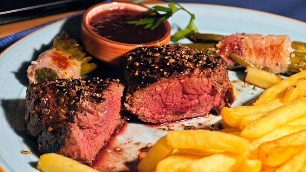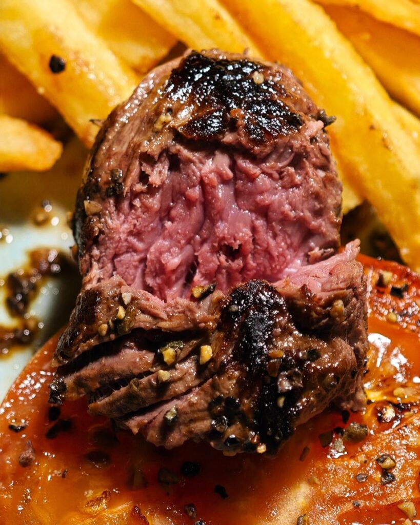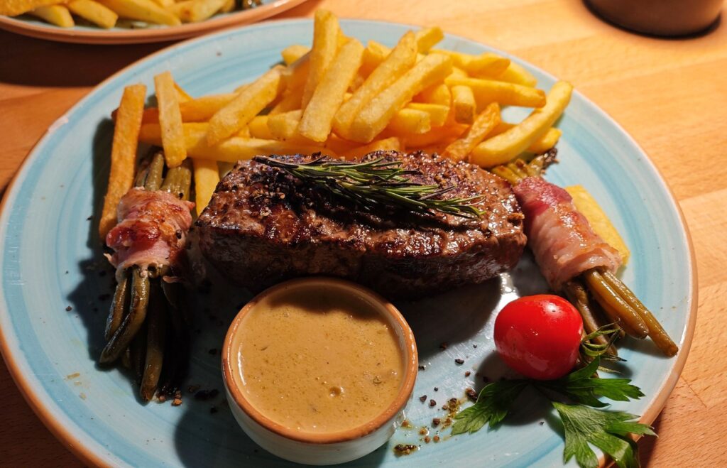 Der berühmte Tennessee Whiskey verleiht der Sauce eine sanfte, rauchige Süße. Die Kombination mit grünem Pfeffer ist exzellent: cremig, mit leichter Schärfe und einer dezenten Säure. Das Steak selbst, medium-rare gegrillt, ist unglaublich saftig und zart und hat eine herrliche Kruste. Frischer Rosmarin sorgt für ein waldiges Aroma. Als Beilage serviert das Restaurant Speckbohnen – rauchiger Bacon trifft auf butterweiche Bohnen.