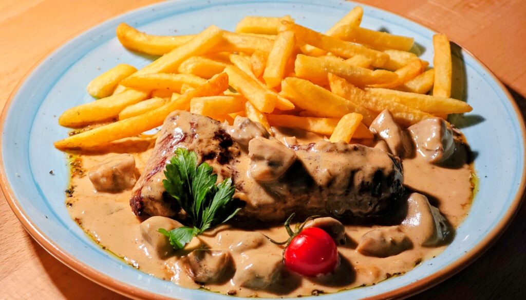 Bestellt man es „well done“, präsentiert es sich überraschend zart mit einem intensiven Eigengeschmack. Es wird von einer sämigen Pilzsauce mit reichlich sautierten Champignons begleitet, die dem Gericht Tiefe verleihen, ohne zu schwer zu wirken.