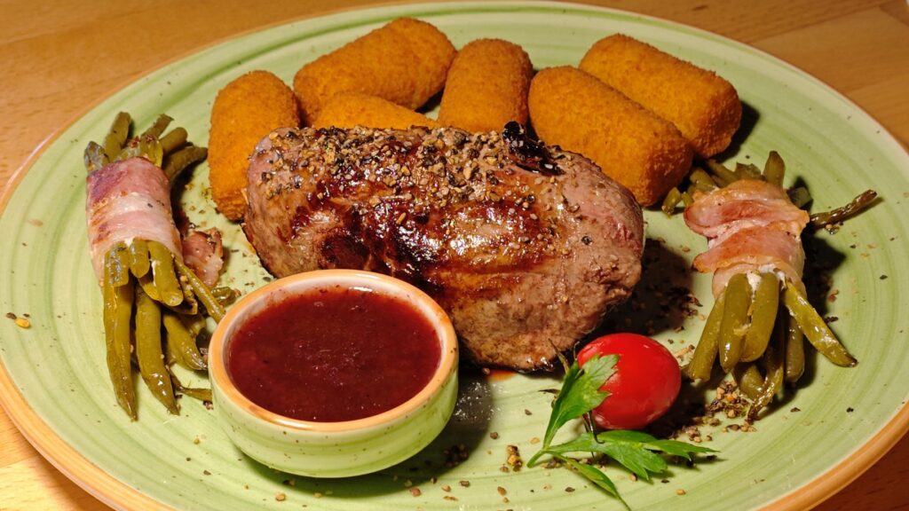 Lenny’s Lemon Grilled Känguru-Steak mit Preiselbeersauce, Speckböhnchen und Kroketten