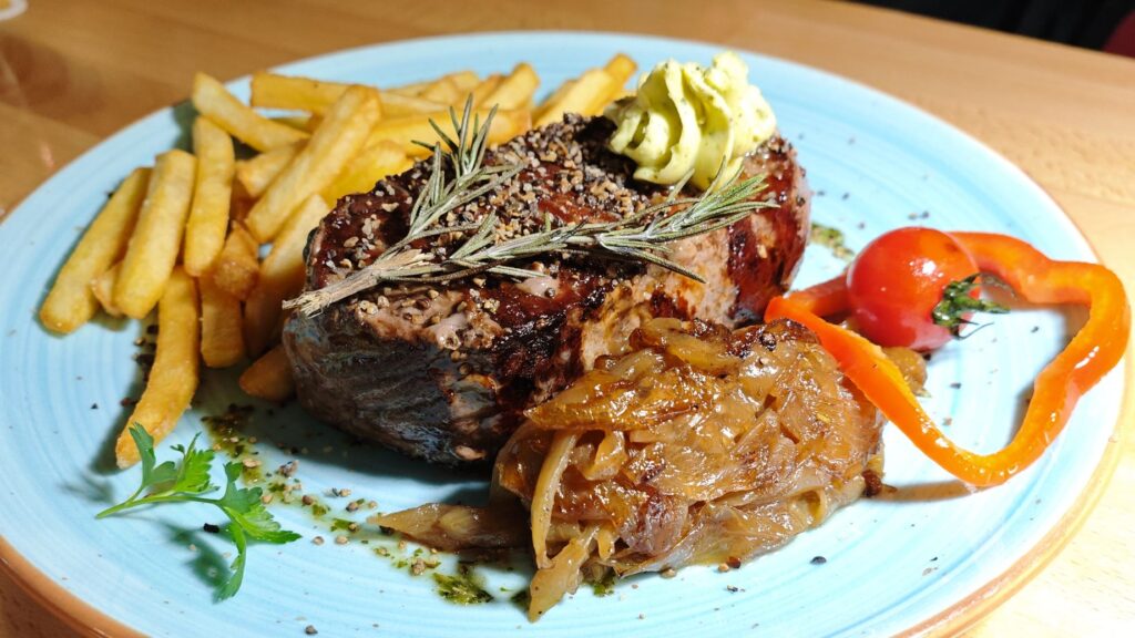 Das Aushängeschild des Hauses hält, was es verspricht. Es ist ein stattliches Steak, das medium-rare auf den Punkt gegart ist, pfeffrig und extrem saftig. Die würzige Kruste und die schmelzende Kräuterbutter sorgen für ein seidiges Mundgefühl. Abgerundet wird das Ganze durch weich geschmorte Zwiebeln, Paprika und Tomaten sowie den rustikalen Duft von frischem Rosmarin.