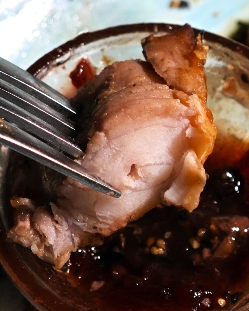 Der Krautsalat ist eine Überraschung: Es ist leicht cremig, frisch und hat eine feine Kräuternote – ein wunderbar säuerlicher Kontrast zum Fleisch.