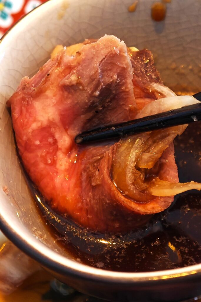 023 Gyu Tataki (牛たたき) – japanisches Roastbeef mit süßen Zwiebeln und Wasabi-Ponzu-Soße