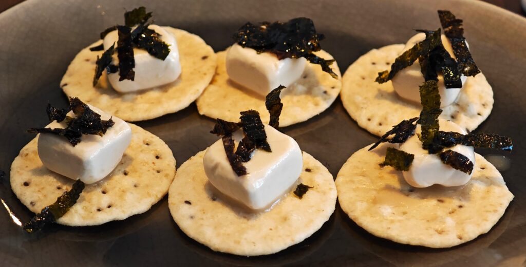 004 Shoyu-Zuke Cream Cheese (クリームチーズ醤油漬け) – Frischkäse mariniert in Soja- und Mirinsoße, serviert auf Crackern
