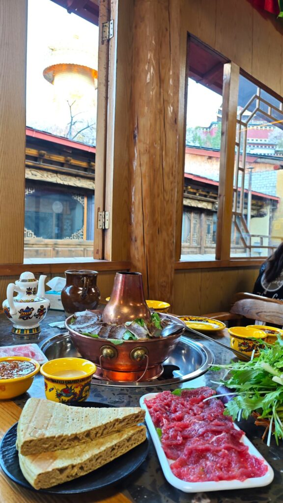 Ein Muss in dieser Höhe ist das Trio aus kräftigem Yak-Hotpot (牦牛肉火锅), herzhaften Gerstenfladen (青稞饼) und charakteristischer Buttertee (酥油茶).