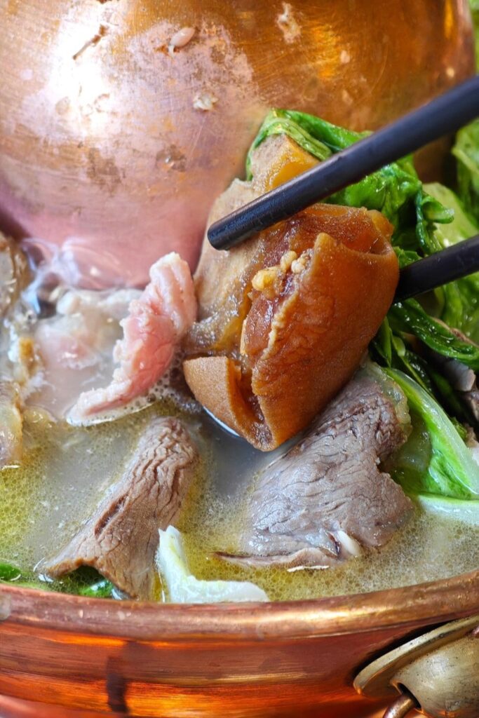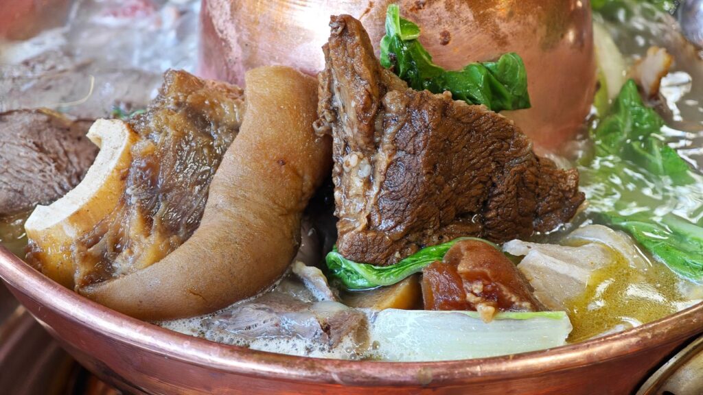 Serviert wird der Hotpot mit einer vielfältigen Auswahl an Zutaten: zartes Haxenfleisch, weich-gelatinöse Sehnen, fleischige Rippen und sogar Stücke vom Huf. Dazu gibt es breite Nudeln und frisches Gemüse.
