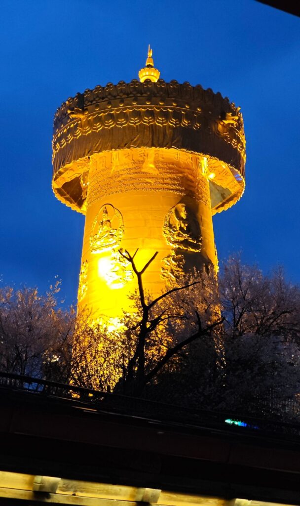 Wir saßen am Fenster, eingerahmt vom großen Gebetsrad und einem tiefblauen Himmel. Bis zur Dämmerung blieben wir, beobachteten, wie das Gold des Rades langsam im dunkler werdenden Blau aufleuchtete – ein stiller, vollkommen runder Moment.