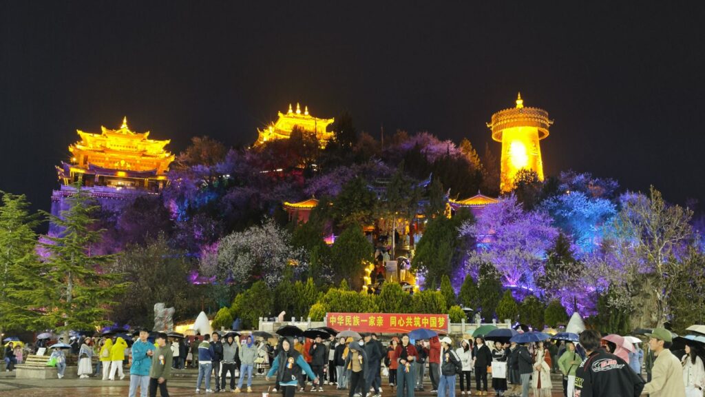 Mit Einbruch der Dämmerung wird Dukezong lebendig. Auf dem Platz des Mondlichts (月光广场) formieren sich spontan Menschenmengen zum Guozhuang-Tanz (锅庄舞) (🎬 24 s).