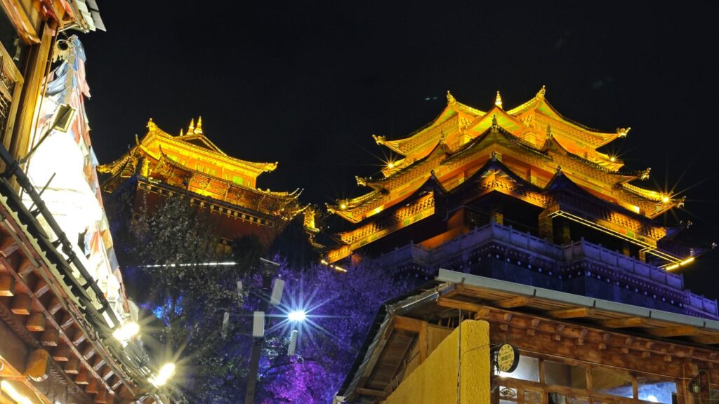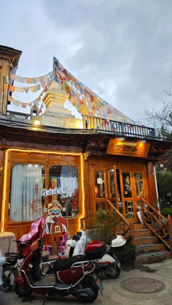 Im warmen Abendlicht beginnen die alten Gebäude und die bunten Gebetsfahnen zu leuchten. Wir schlendern durch die Altstadt, vorbei an Läden mit feinem Kunsthandwerk, während leise tibetische Musik durch die Straßen hallt.