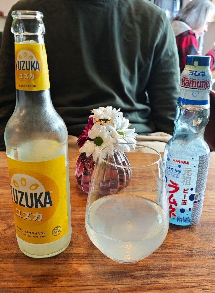 Sweet, bubbly, an iconic Japanese soft drink. It comes in a uniquely shaped glass bottle sealed with a marble. To open it, pop the marble down into the neck, where it rattles around as you drink – one clever design, as the marble partially blocks the opening, preventing too large a gulp at once (likely intended for kids).