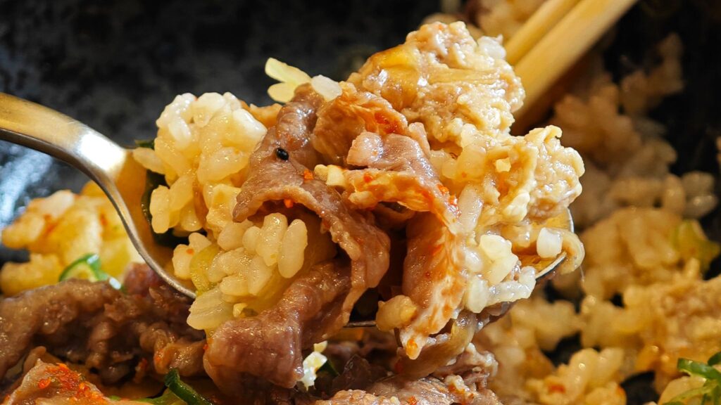 The rice underneath absorbs the sweet richness from the beef and the savory notes from the egg and onion, creating a heavenly mix of sweet and savory – a complete, happiness-inducing experience.