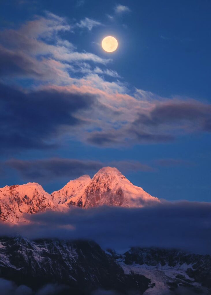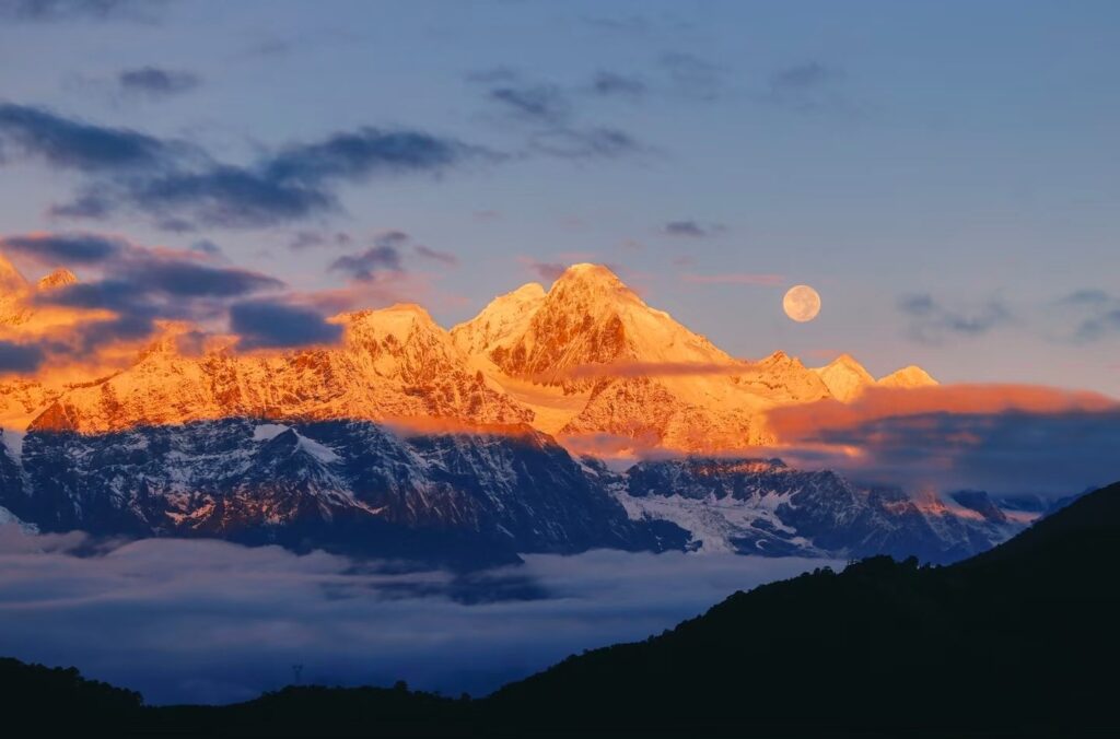 The lower slopes of Kawagebo were bathed in a cool, ethereal silver from the moonlight, while the peak began to blush with warm, golden-pink alpenglow. For a few sacred minutes, the mountain was a gradient canvas of silver, pink, and gold—a celestial wonder of sun and moon shining together.