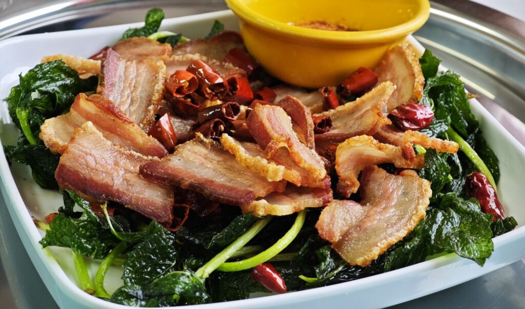 Paper-thin, crackling-crisp pork belly tossed with fragrant dried chili and fresh mint leaves. Each bite is a heavenly mix of smoky spice, herbal freshness, and savory crunch—absolutely addictive!
