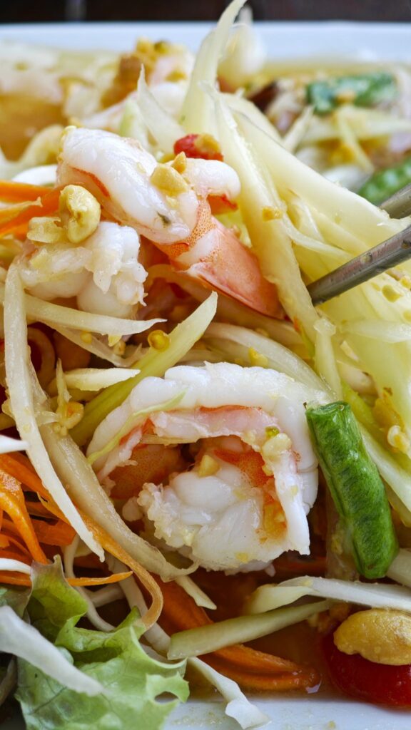 Plump shrimp and roasted peanuts add nutty, savory depth. The dressing is the best part: lightly sweet, subtly creamy, and nutty from fermented fish sauce (nam pla), tying everything together with an addictive umami tang.