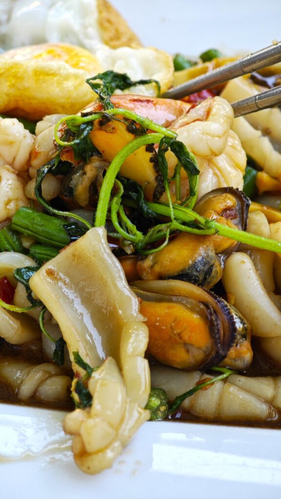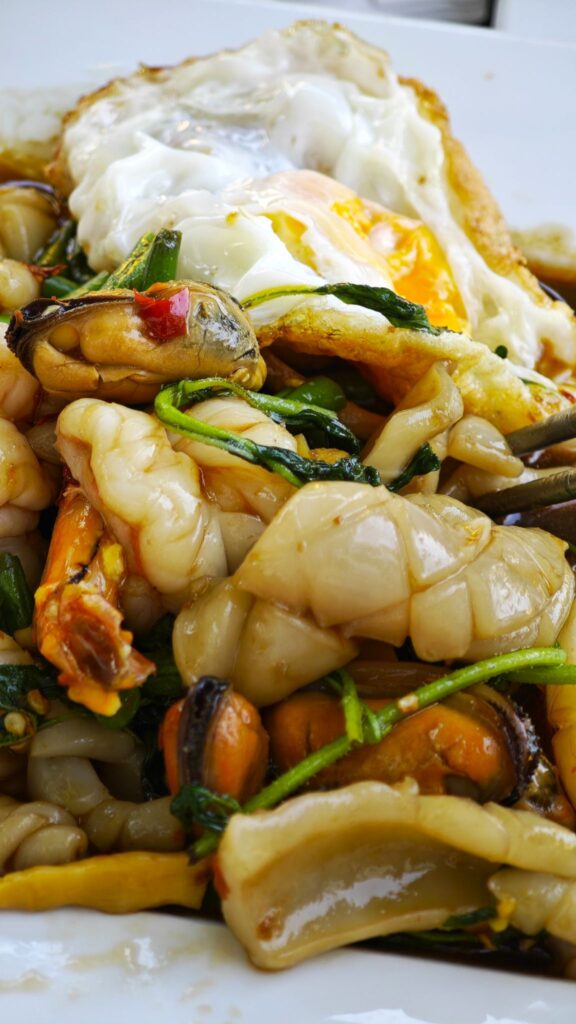 The holy basil (kra pao), a peppery, slightly anise-like herb, infuses the dish with its irreplaceable scent. Stir-fried with fiery chilies and fish sauce, it’s seriously spicy-sweat. On top is a fried egg with a runny yolk. Piercing that golden orb lets the rich liquid cascade over the seafood and rice, creating a luxurious, velvety sauce that tempers the intense spice, adding a layer of comfort.