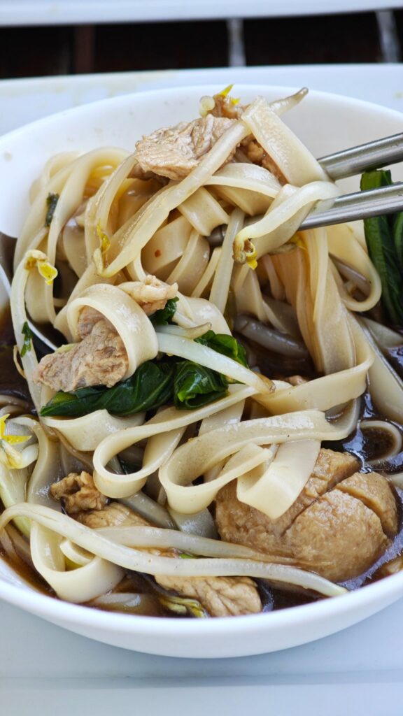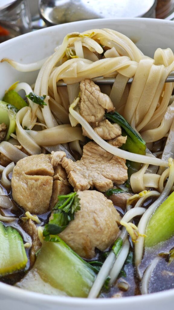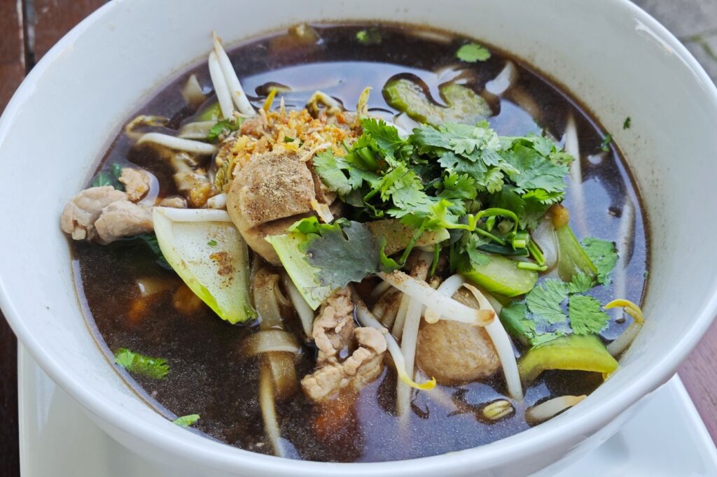This famous Isaan (Northeastern Thai) dish, umami-rich and meaty, is named for the waterfall-like sensation of flavors. It features wide, silky rice noodles and tender pork, beef and bouncy beef balls, all bathed in a dark, thick soup.
