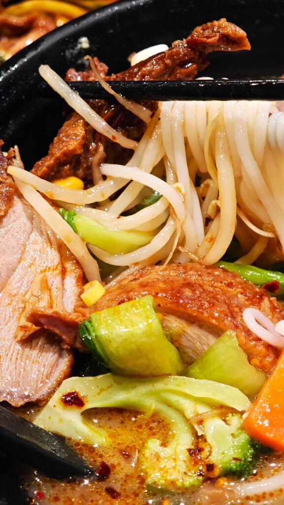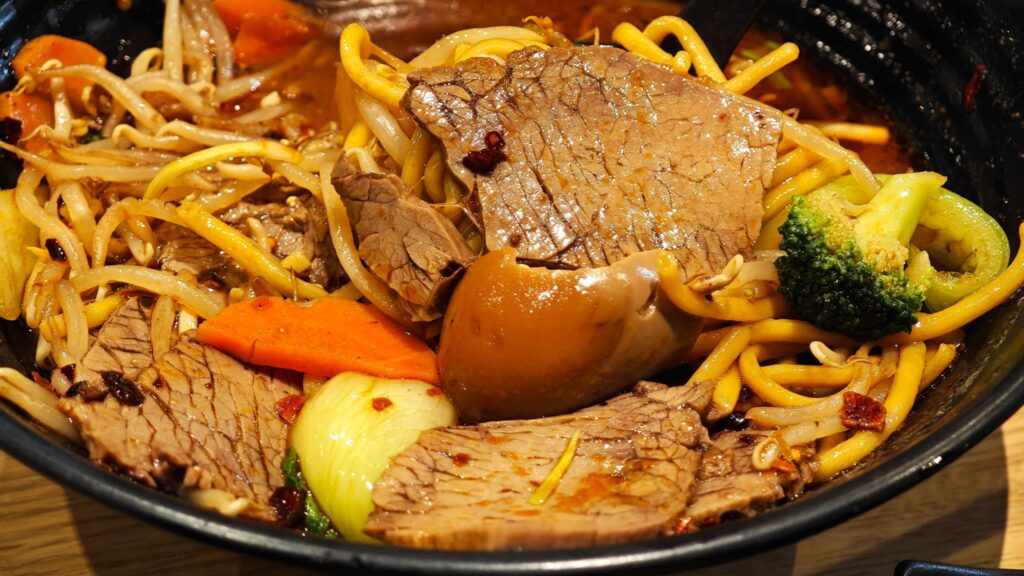 The hong shao broth, a Cantonese-style soy-based broth, is dark, velvety, and layered with umami. It’s deeply savory, with a meaty, almost caramel-like richness, where saltiness meets subtle sweetness, while warming spices – ginger, garlic, and five-spice – linger in the background.