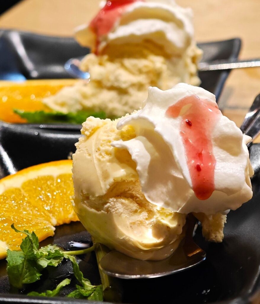 We went with a refreshing vanilla ice cream – a plate of creamy vanilla base, zesty orange slice, mint, and whipped cream cloud.
