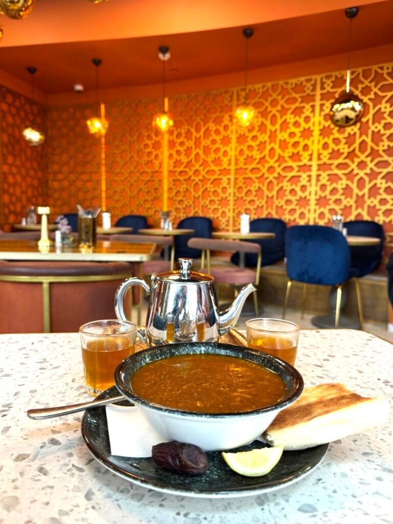 The restaurant ambiance is awash in a warm, golden light, with decor mixing Middle Eastern mystique and Mediterranean warmth. The golden, almost cinematic glow is said to be a classic element of traditional Moroccan design, meant to mirror the warmth of the desert and the luxury of a riad.