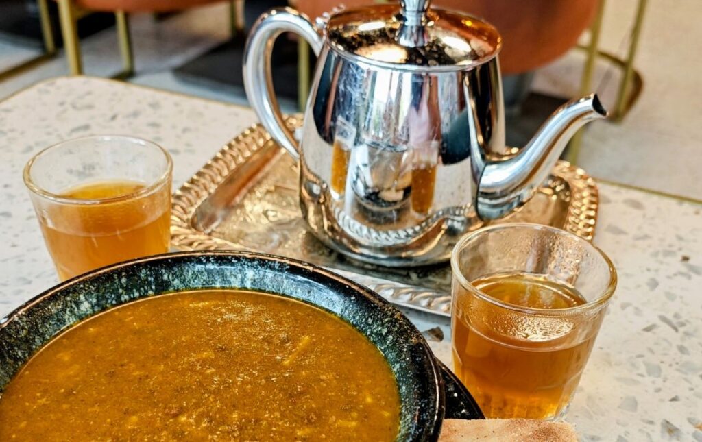 Let’s start with its symbol of hospitality: a pot of Moroccan tea. It’s a delicate brew—mildly sweet, with a gentle, herbal tea base with a fresh mint flavor. It’s soothing and refreshing.