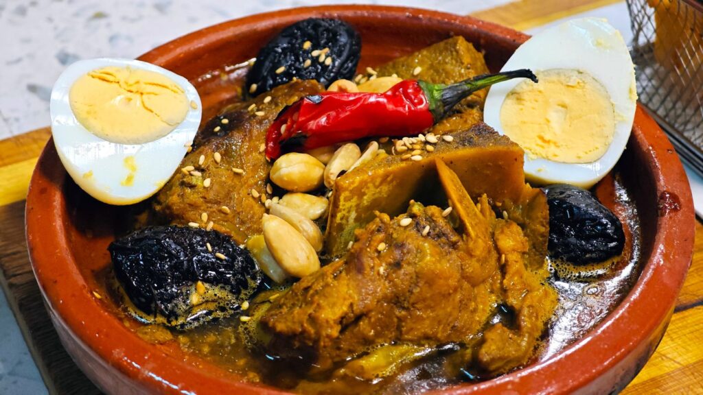 The stew is full of contrasts: the sweet depth of dried plums and dates, the lemony sour notes, and the spicy surprise of a red chili. A boiled egg and toasted almonds add rich texture. If you switch to rice (from fries), let it soak up all that saffron-cumin goodness for an ultimate comfort bite.