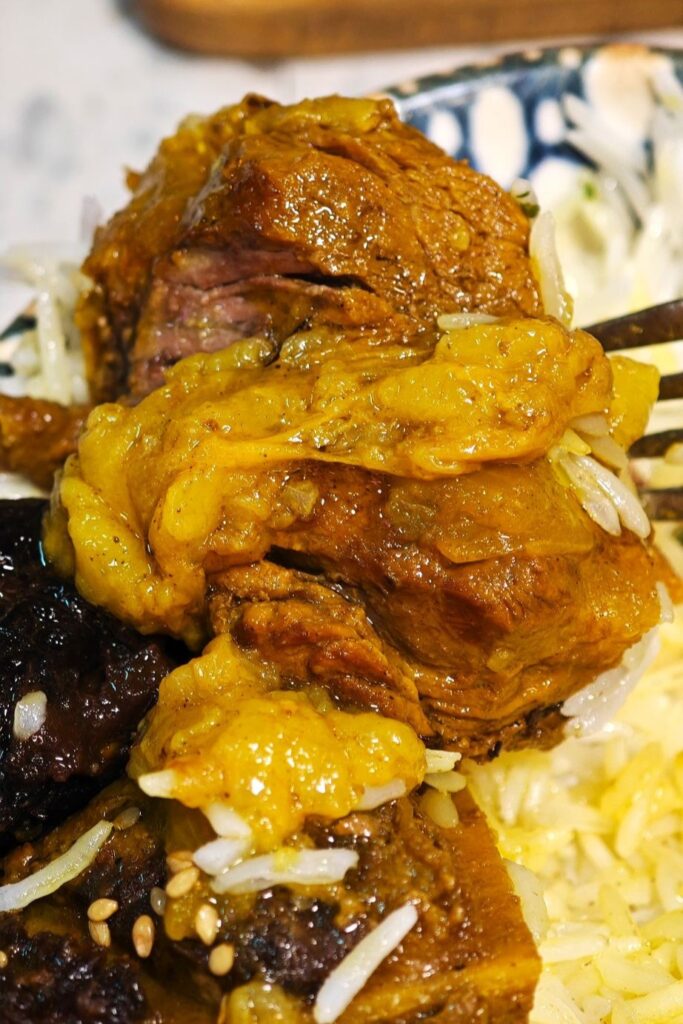 The skin, wrinkled and slightly crisp from slow cooking, is a flavor bomb of ginger, saffron, and sweetness.