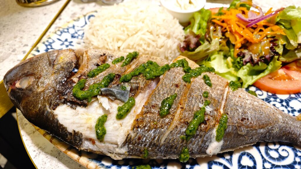 A whole, beautifully grilled fish, impressive in size and flavor. The skin is crisp and savory, while the flesh is unbelievably soft, flaky, and juicy—so moist it practically glistens. It is served with a fresh, herbal green sauce (a classic Moroccan chermoula, made with parsley, cilantro, garlic, and lemon) that offers a light, veggie-bitterness to cut through the richness.