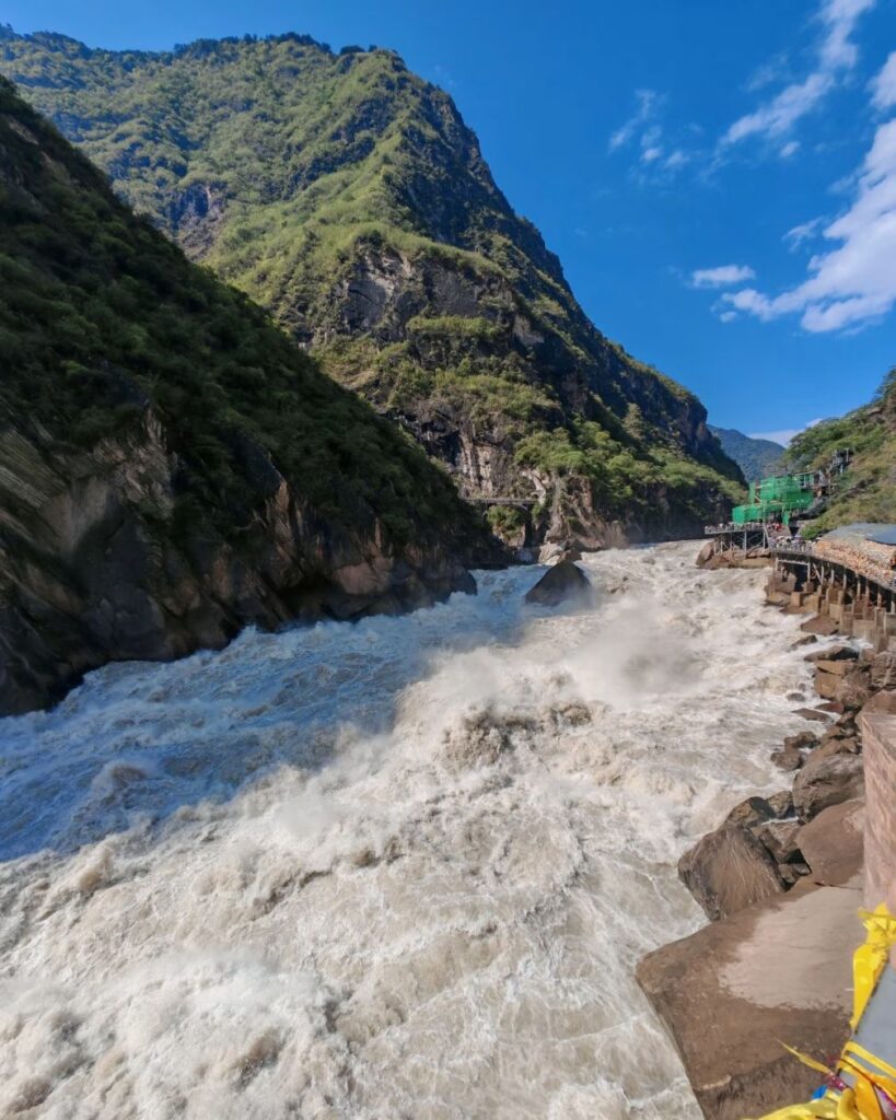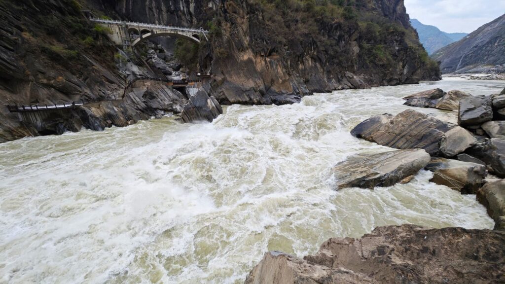 - Upper Tiger Leap (上虎跳): This is the canyon’s entrance, where the river is violently squeezed between the two mountains. The channel narrows, the water accelerates into a raging torrent, and the roar is deafening, truly like a ferocious tiger’s roar. A massive boulder lies in the heart of the river, splitting the current in two and creating a spectacular, cascading drop.