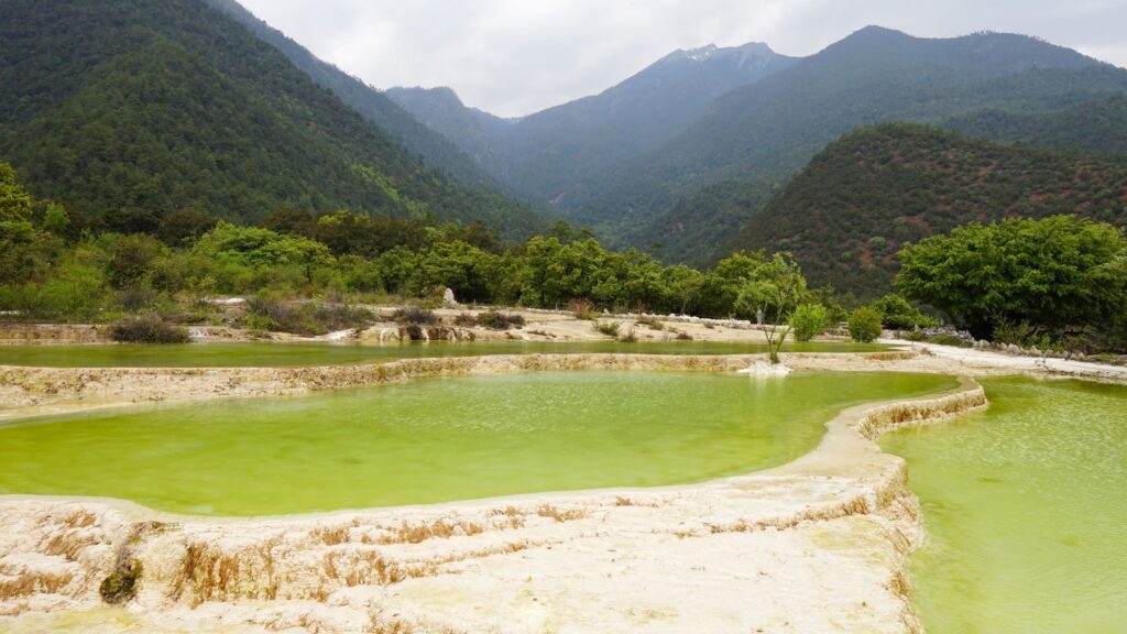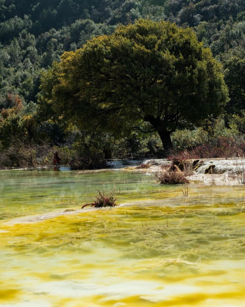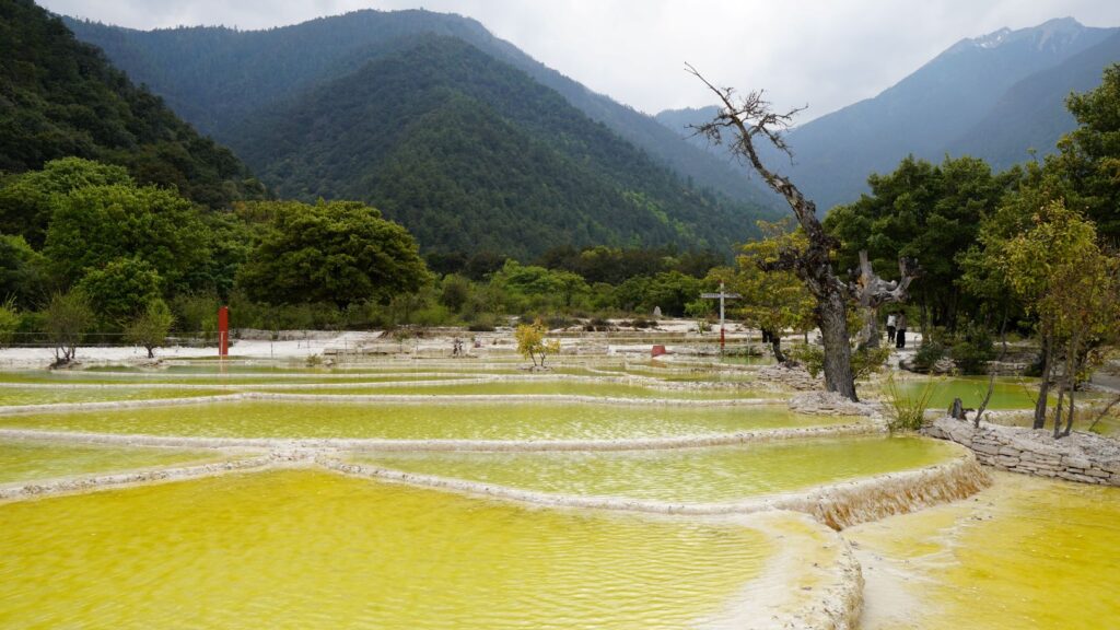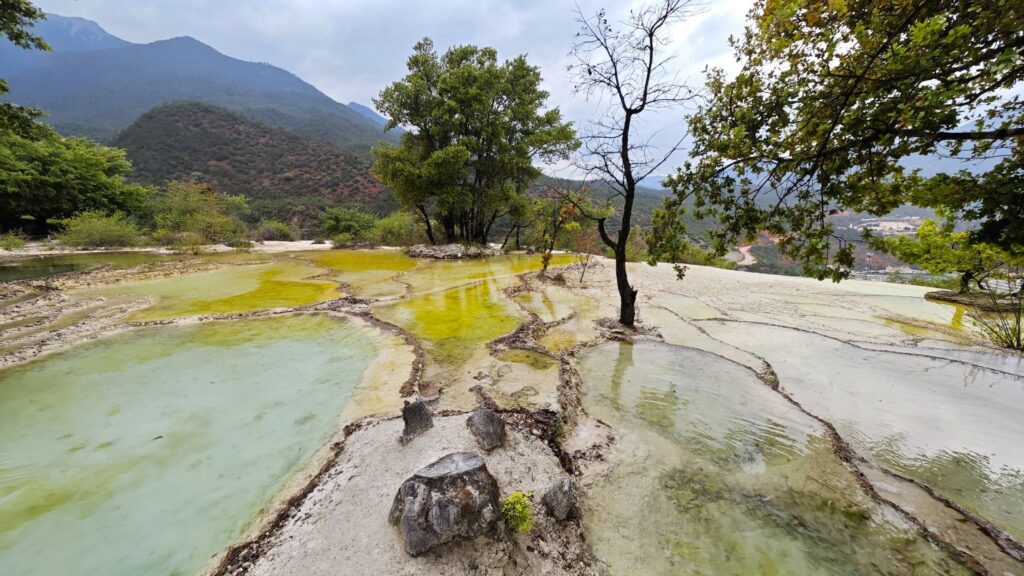 Reaching the main viewpoint, you’ll see cascading pools reflect shades of sky blue, turquoise, pale green, and yellow, with water flowing softly like music. Small trees poke through the pools, and the sunlight creates sparkling highlights across the terraces, giving the impression that heaven itself has spilled a palette of colors over the land.