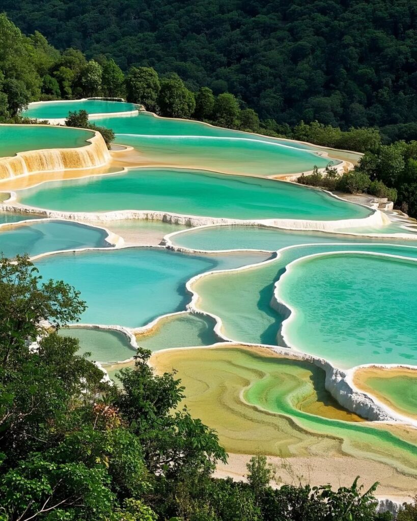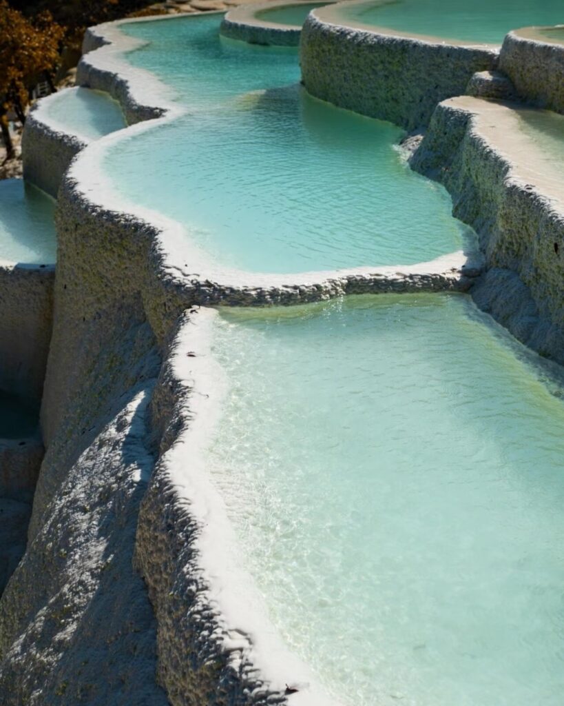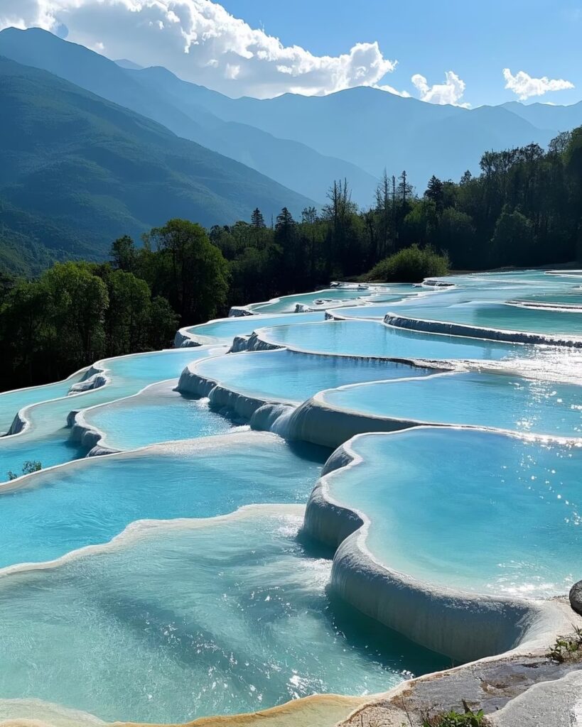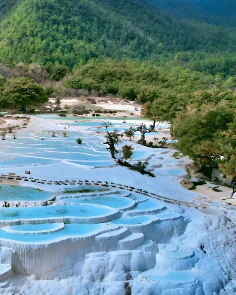 The terraces are a stunning palette of milky white, turquoise, and sky blue. Water trickles gently over the step-like formations, creating a scene so serene it feels sacred. It’s a place where clouds seem to get caught in the trees and the light plays magic tricks on the water.