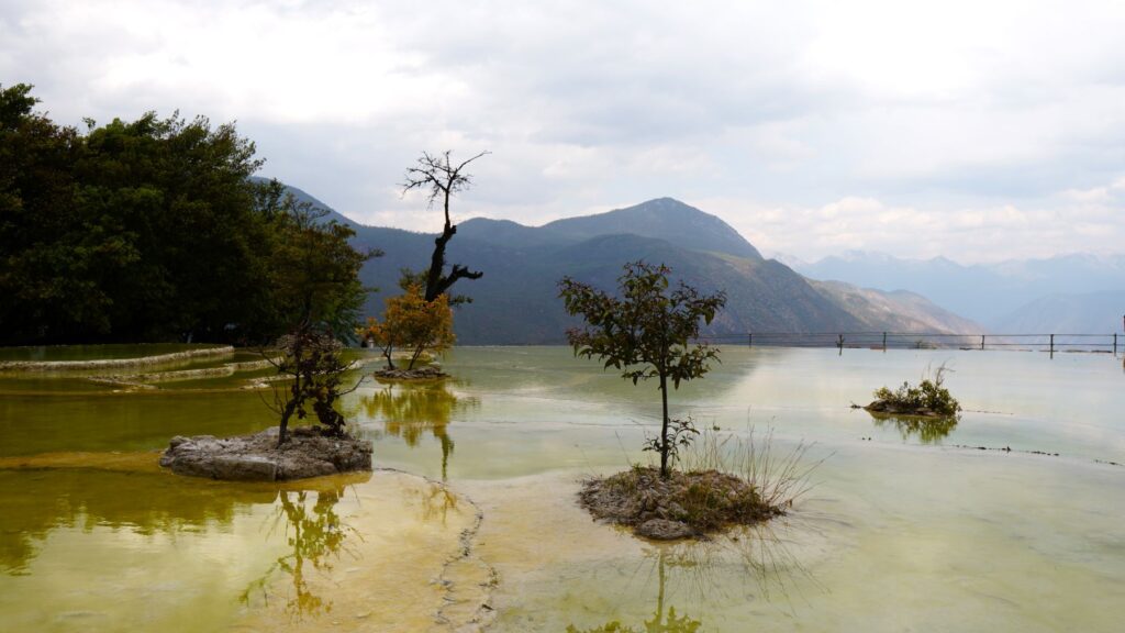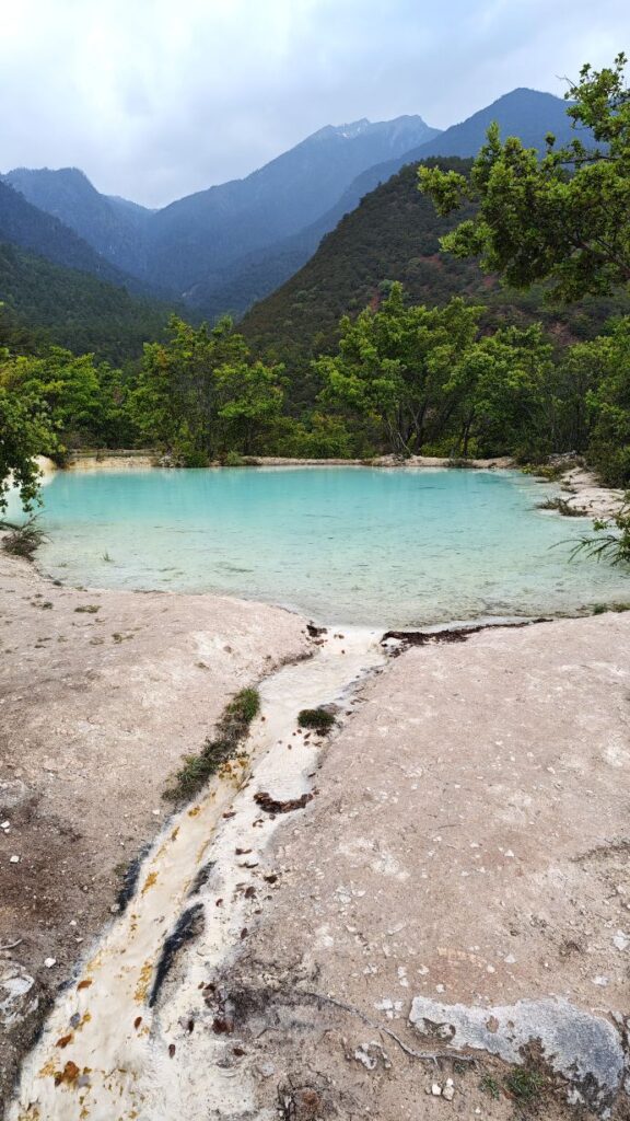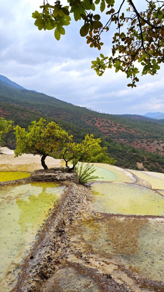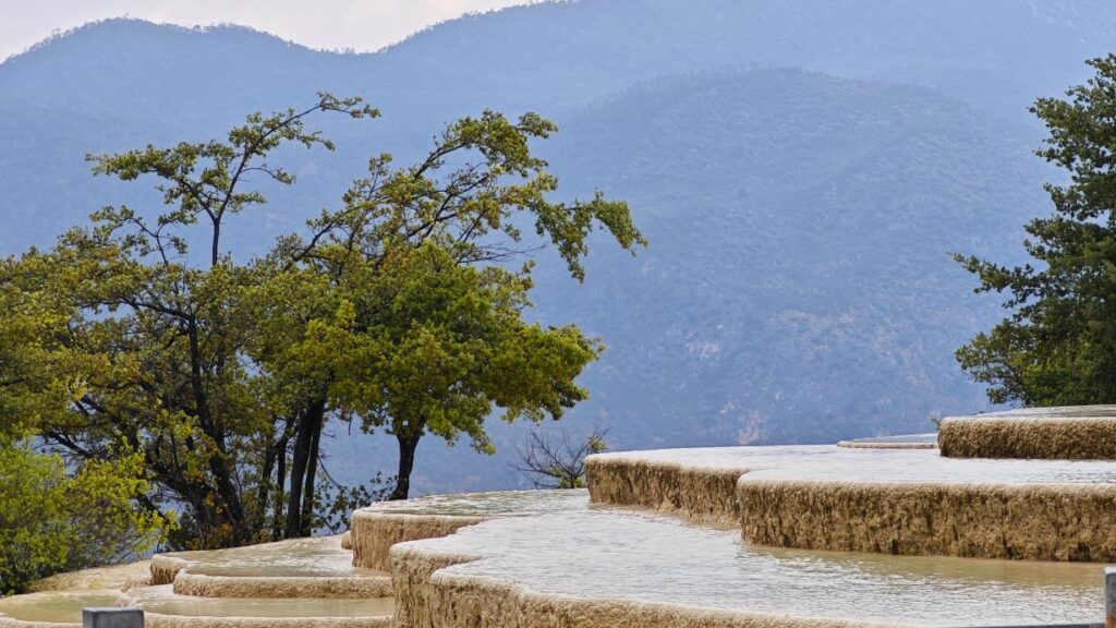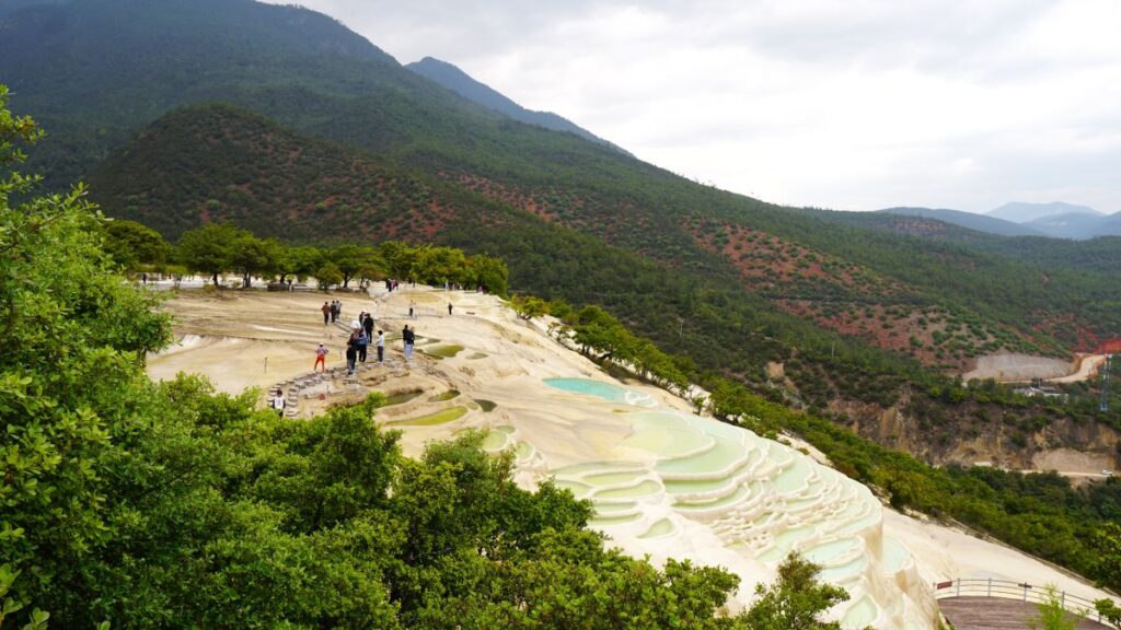 The terraces are a stunning palette of milky white, turquoise, and sky blue. Water trickles gently over the step-like formations, creating a scene so serene it feels sacred. It’s a place where clouds seem to get caught in the trees and the light plays magic tricks on the water.