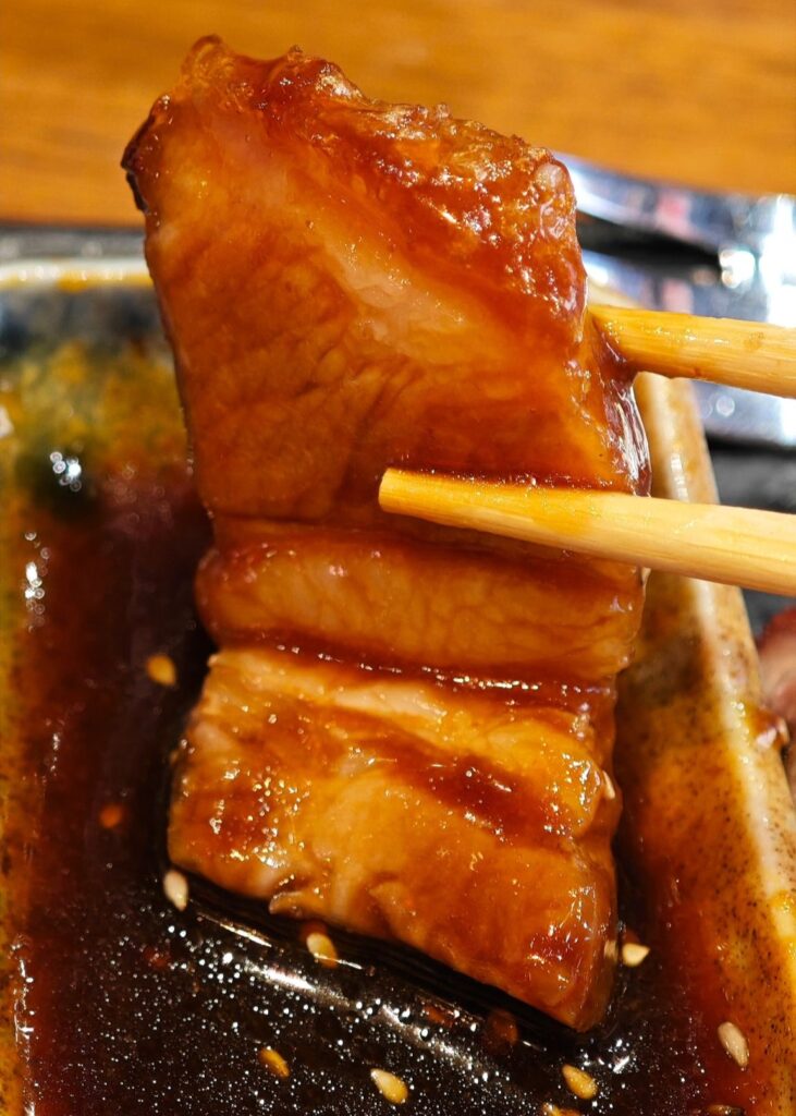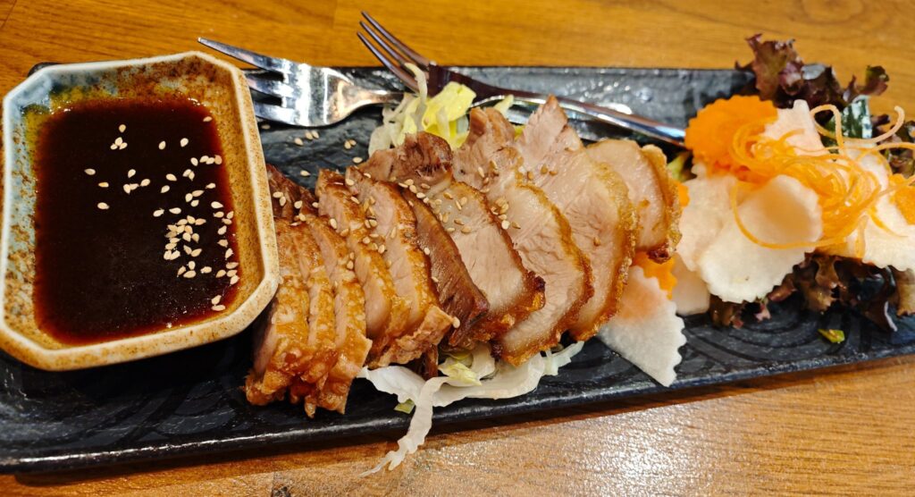 It comes with a hoisin dip, often called the “Asian barbecue sauce”. Rich and glossy, it has a deep molasses-like sweetness, hints of soy and garlic, and a slight smokiness and umami – complementing the rich meat flavor.