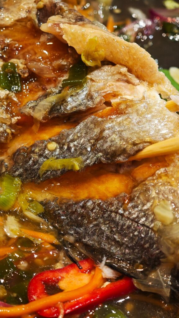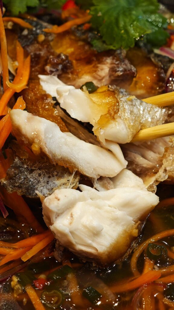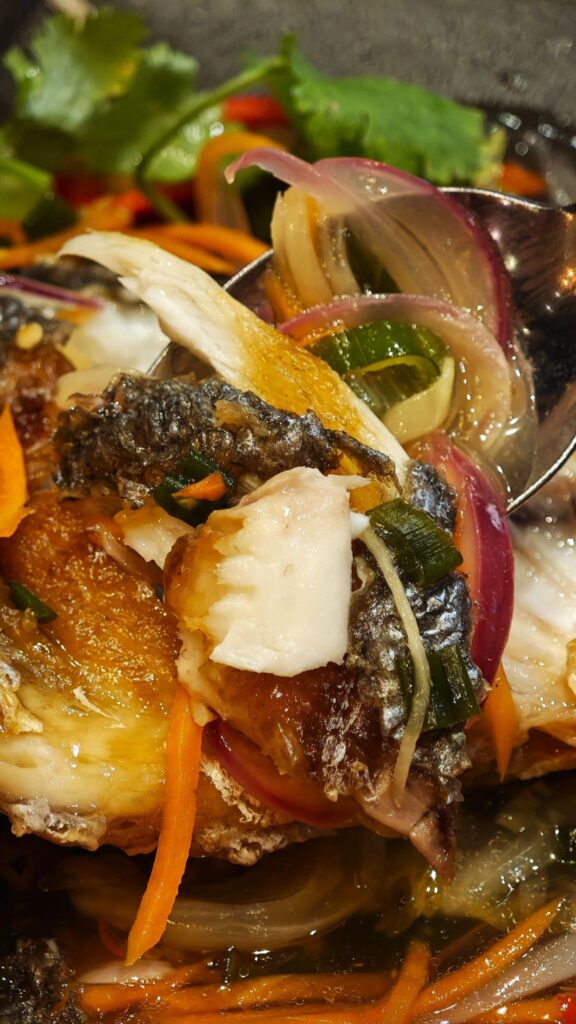 It features a whole dorade (sea bream), its skin fried to a shattering crisp, covered in a ginger marinade that tingles with heat, then mellows into honeyed warmth.