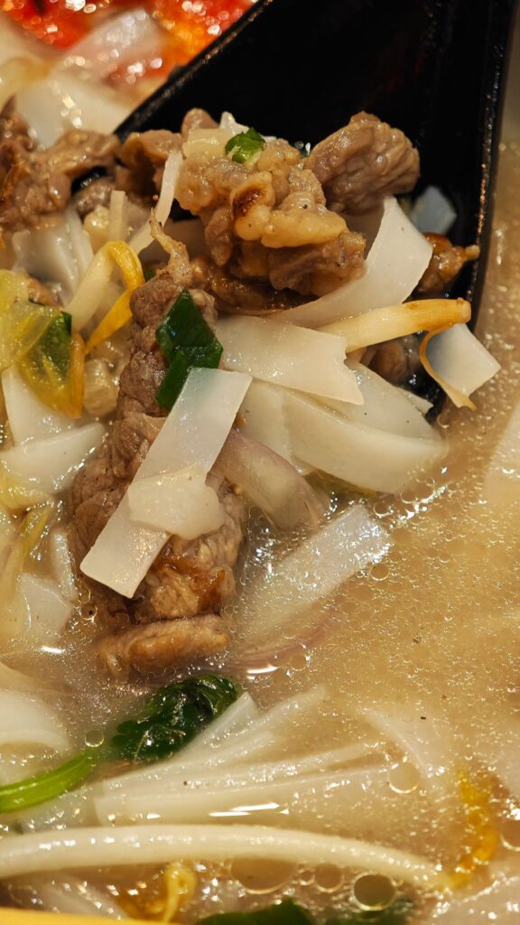 The beef — instead of the usual raw slices that cook in the broth, this version features thin, well-marbled cuts, first quickly pan-seared for a caramelized crust, then gently poached in the soup. It’s juicy, tender with a whisper of smokiness from the wok.