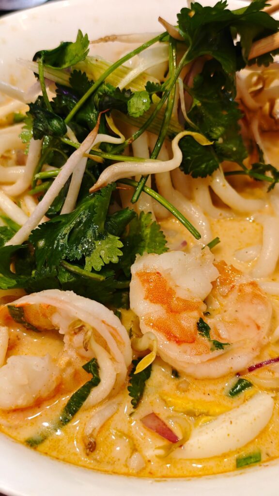 When it arrives, the scent of coconut milk, lemongrass, and fiery curry swirls up from the bowl, hinting at something rich, complex, and utterly comforting.